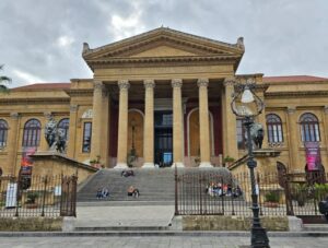 «L’arte rinnova i popoli e ne rivela la vita. Vano delle scene il diletto ove non miri a preparar l’avvenire» sono le parole che abbiamo letto sull’architrave del sontuoso Teatro Massimo di Palermo, il teatro più grande d’Italia e terzo in Europa. Questa frase vuole sottolineare la grande importanza dell’Arte e della Cultura nell’impegno e nella crescita formativa di una società civile. Abbiamo potuto fare un tour degli interni e in particolare abbiamo visto tre sale: la Sala Grande, dove hanno luogo gli spettacoli e può ospitare fino a 1247 spettatori, il Palco Reale, dotato di un foyer privato detto Salone del Sovrano, e la Sala Pompeiana, nota anche come Sala dell’Eco per la sua acustica particolare (parlandoci all’interno il riverbero aumenta avvicinandosi verso il centro).